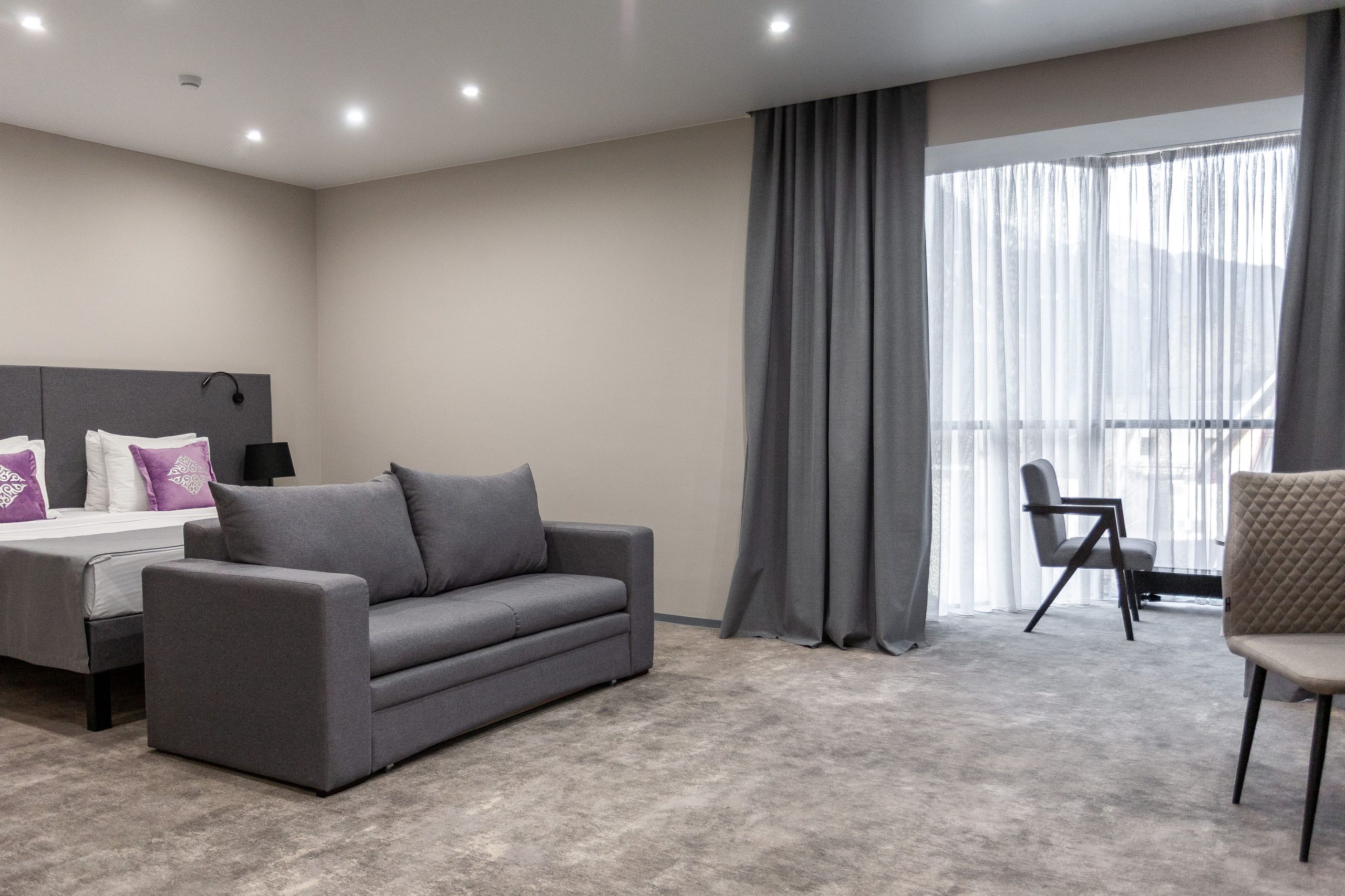 Номер Джуниор Сьют в отеле АССА, площадью 40м2 — просторное и элегантное пространство, идеально подходящее для отдыха. Номер выполнен в современном стиле с улучшенной планировкой и раздельными зонами гостиной и спальни, что создает атмосферу уюта и комфорта. В спальной зоне — большая двуспальная кровать или две односпальные кровати, просторный шкаф для личных вещей. Удобное рабочее место и диван. Современный телевизор. Каждая деталь номера продумана для максимального удобства гостя, что делает его отличным выбором для тех, кто ценит комфорт и стиль во время отдыха на курорте Домбай.